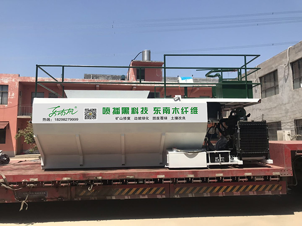 濕法客土噴播使用的設(shè)備是泥漿泵噴射機(jī),這種設(shè)備的基本構(gòu)造與液壓噴播機(jī)基本一致, 都是由柴油機(jī)動(dòng)力系統(tǒng)、攪拌系統(tǒng)、泵送系統(tǒng)和噴射系統(tǒng)構(gòu)成。將客土材料和水裝進(jìn)儲(chǔ)料灌中, 經(jīng)過(guò)機(jī)械+回流攪拌, 形成固形物重量含量超過(guò) 50%的混合漿液( 最大濃度 60%) , 再通過(guò)泵送系統(tǒng)將高濃度泥漿噴射到作業(yè)面上。濕法客土噴播所形成的客土厚度較干法客土噴播要薄, 一般為 3~5cm; 噴射距離較近,一般在 30~50m 左右。