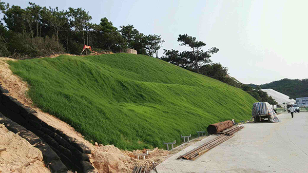 (1) 對(duì)于第一類邊坡,基本上采用對(duì)坡面直接液壓噴播草籽的方法。邊坡坡度的大小對(duì)草籽的發(fā)芽生長(zhǎng)有較大的影響,坡度較緩,則草坪生長(zhǎng)的持久性較好,不需采取挖溝、挖坑或其它補(bǔ)助措施。在種籽噴播施工時(shí),先對(duì)邊坡進(jìn)行簡(jiǎn)易修整,然后使用噴草機(jī)將種籽、肥料、覆蓋材料、土壤改良劑、保水劑、色素和防蝕劑等加水?dāng)嚢韬笾苯訃姙⒃谶吰碌谋砻?,然后覆蓋無(wú)紡布,這樣即可減少雨水沖刷和侵蝕,防止種籽在發(fā)芽期移動(dòng)流失,又可防止地表水分蒸發(fā),起到保溫和保濕的作用。無(wú)紡布由木纖維組成,覆蓋地面三個(gè)月內(nèi)將完全降解。所用草種根據(jù)地區(qū)不同而不同,華南地區(qū)所采用的草籽以百慕大草和百喜草為主,其中摻以少量的畫(huà)眉草,冬季可加一定數(shù)量黑麥草。多種草籽混播,可使邊坡草坪適應(yīng)差別較大的土壤和氣候條件,能更快地覆蓋土表,并能延長(zhǎng)邊坡草坪的使用年限。