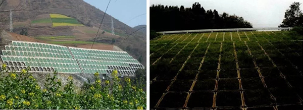 2、骨架植物防護(hù)技術(shù):采用混凝土、漿砌片塊石、卵(礫)石等材料做骨架,框格內(nèi)宜采用植物防護(hù)或其他輔助防護(hù)措施 。包括漿砌片石或水泥混凝土骨架植草護(hù)坡、多邊形水泥混凝土空心塊植物護(hù)坡以及錨桿錨索混凝土框架植物防護(hù)。
